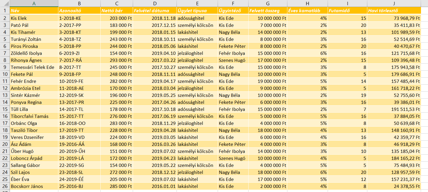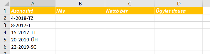 Táblázatunk egy hitelintézet ügyfeleit tartalmazza. Látjuk az ügyfelek nevét, azonosítóját, nettó bérét és a hitellel kapcsolatos összes többi adatot. A következő munkalapon ki van emelve néhány ügyfél azonosítója az A oszlopban. Első lépésben jelenítsük meg az azonosítókhoz tartozó neveket. Az FKERES függvényt most nem alkalmazhatjuk, hiszen ha megnézzük az ügyféllista munkalapon szereplő táblázatot egyértelműen látszik, hogy az azonosítók a B oszlopban vannak, a nevek pedig az A-ban, az azonosítóktól balra.