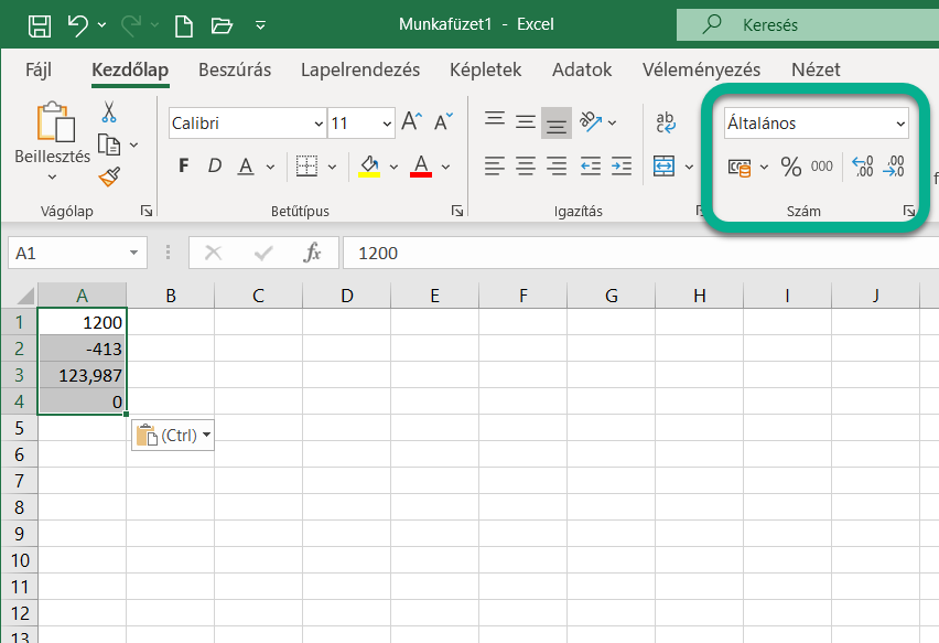 A számformátumok beállításához jelöljük ki a cellákat és használjuk a Kezdőlap Szám csoportját. Itt olvashatjuk le azt, hogy a kijelölt cellákban szereplő értékeknek mi a számformátuma. Akapesetben Általános, vagyis az értékeken semmilyen formátum nincs.