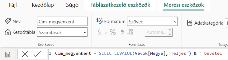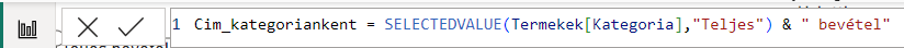 A feladatunk a következő. Ha rászűrünk egy megyére, akkor a vizualizáció címe ennek megfelelően változzon meg. Tehát ha például Pest megyére szűrünk, akkor a cím az legyen, hogy Pest bevétel. Ha nem szűrünk egy megyére sem, akkor pedig azt írja ki, hogy Teljes bevétel. Ezt a dinamikusan változó címet a SELECTEDVALUE függvény segítségével készítjük el. Először is hozzunk létre egy új mértéket, adjunk neki nevet! Szúrjuk be a SELECTEDVALUE függvényt és nézzük, hogy milyen argumentumokat vár.