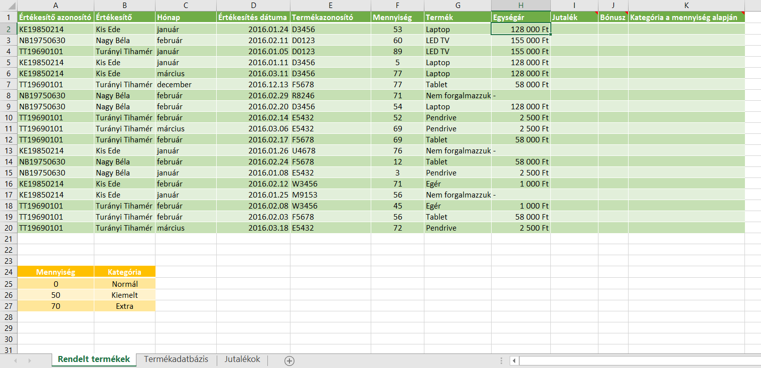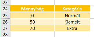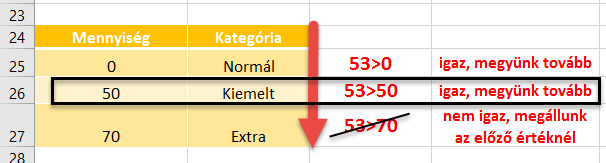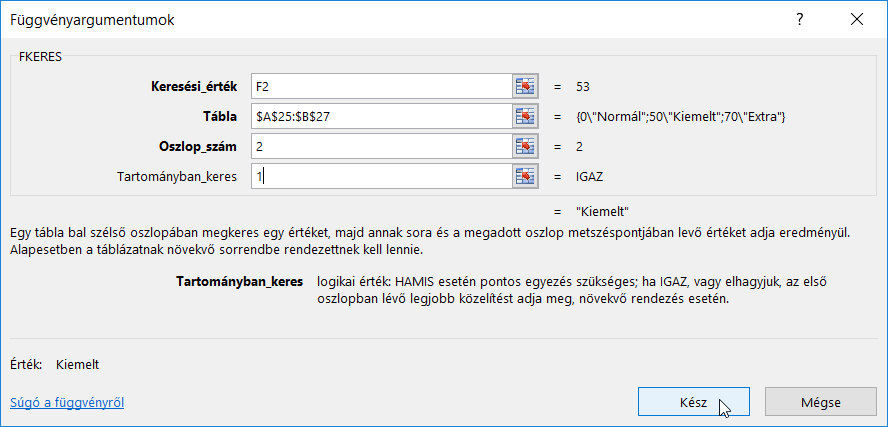 Nézzük meg, hogyan is működik az FKERES az ilyen jellegű keresések esetén! Az első konkrét érték, amit be szeretnénk sorolni valamelyik kategóriába, az az F2-es cellában szereplő 53. Tulajdonképpen ezt az értéket kell megkeresnünk a kis segédtáblázatunk első oszlopában. Természetesen ez az érték ott nem szerepel, de nincs is rá szükség, hogy pont ezt megtaláljuk. Elég, ha a függvény megáll annál az értéknél, ami az 53-hoz alulról a legközelebb esik. Ez pedig az 50, így kerül az 53 a Kiemelt kategóriába.