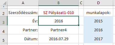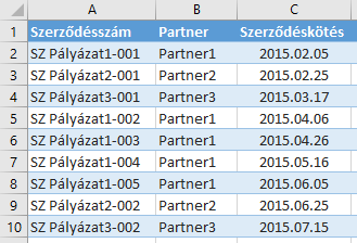 Példánkban szerződésszám alapján keressük a szerződés adatait a megadott három munkalapon.