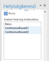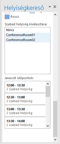 Ha az új értekezlet összehívásakor szeretnénk előre tudni, hogy az adott időpontban a résztvevők közül mindenki szabad-e, illetve az értekezletre lesz-e szabad hely, akkor az új értekezlet panelen figyeljük a jobb oldalon megjelenő Helyiségkereső ablakot! Ahogy megadjuk a résztvevőket aCímzett rovatban, és megadjuk az időpontot, a Javasolt+ idők listában láthatjuk az ütközéseket.