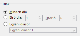 A Diák csoportban megadhatjuk, hogy ha egy hosszabb bemutatónak csak egy részét szeretnénk levetíteni, akkor hányas sorszámú legyen az első (Első dia), illetve az utolsó (Utolsó) dia, ami vetítésre kerül.
